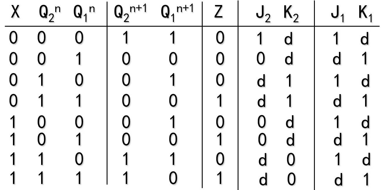 已知$Q_2^{n+1} = XQ_2^n + \overline{X} \cdot \overline{Q_1^n} \cdot \overline{Q_2^n}$,得$J_2 = \overline{X} \cdot \overline{Q_1^n}$,$K_2 = \overline{X}$