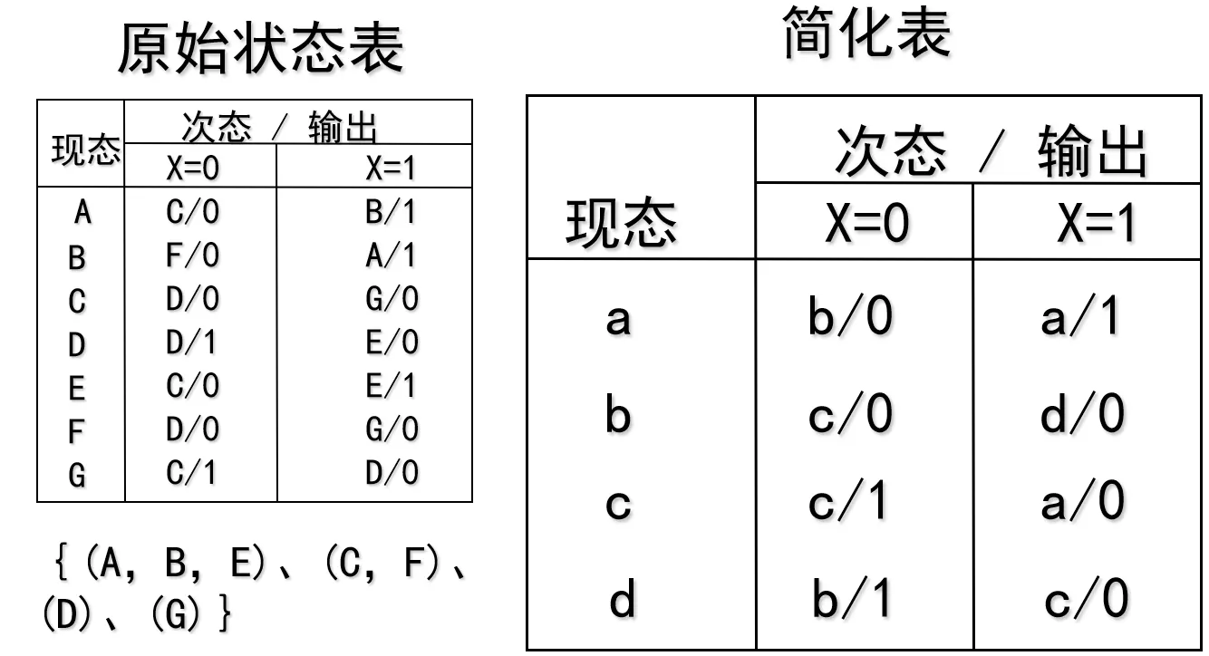 状态化简是比较麻烦的。 目的:(1) 使触发器个数最少; (2) 简化激励方程。化简就是要省略等效状态,即从原始状态表中找出最大等效类的集合,然后用一个新符号表示最大等效类,从而得到最小化状态表。 两个现态等效要求:输出完全相同;次态满足下列条件之一: (1)次态相同; (2)次态交错(循环); (3)次态保持原状态不变; (4)次态对等效。